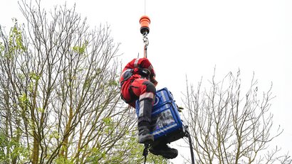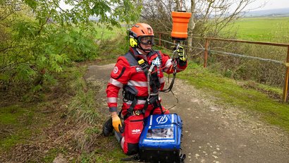 RESCUE-PACK Plus is designed for difficult terrain. The anchor point on top allows the backpack to be transported to areas with poor access. To facilitate handling when transporting the backpack on hospital beds, the backpack can be attached to cross-braces or equipment rails using tensioned belts equipped with magnetic closures. This allows the transported device to remain in RESCUE-PACK Plus while ensuring a reliable connection to patients.